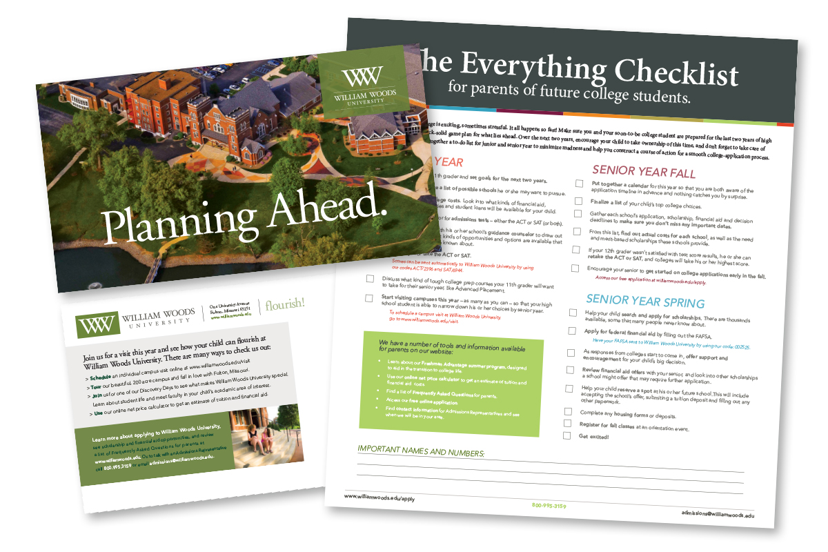 We created this parent checklist print piece to be mailed to a prospective student during their junior year of high school. Our goal with this project was to create something useful and informative — maybe something a parent would hold on to, or even better, hang on a bulletin board next to his or her calendar. The William Woods University logo, contact information and when, how and where to apply is very clear.